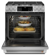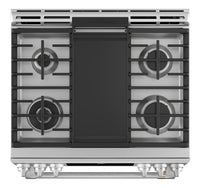 Get the best of both worlds with this dual-fuel convection range from GE Café. Enjoy precise heat control from a mighty gas-powered cooktop and even baking results in the electric oven with True European Convection with Precise Air. An aesthetically-pleasing design adds an element of opulent style, while the Wi-Fi capability makes it easier than ever to stay connected from anywhere, making this range a must-have for masterfully crafted multi-course meals.